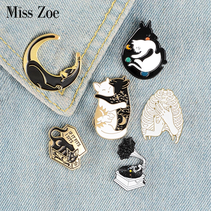 Звездная ночь коллекция эмалированные булавки фонограф Кошка Луна коробка значки на заказ мешочек для брошек одежда отворот булавка Панк Ч...