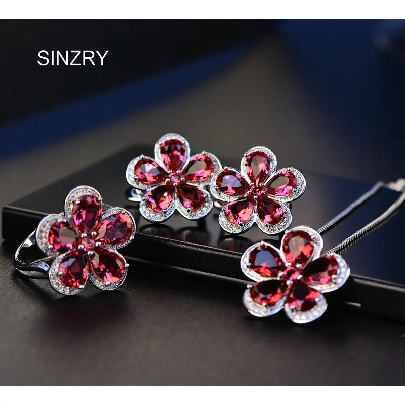 Sinzry Мода cz комплект ювелирных изделий для Для женщин Красная роза Wintersweet Цепочки и ожерелья Серьги набор колец Мода циркония вечерние компл...