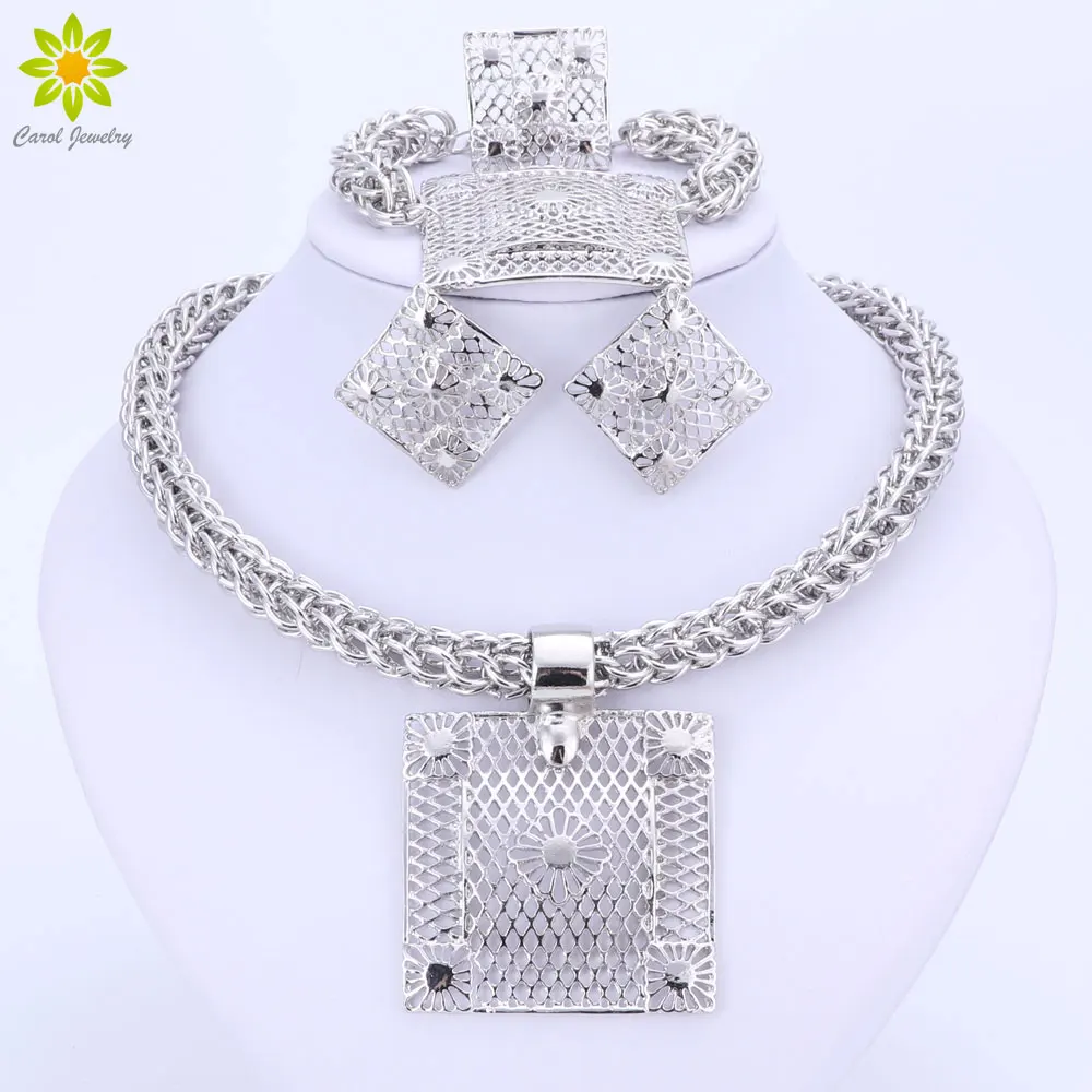 Штраф африканских Бусины посеребренные Ювелирные наборы в нигерийском стиле Свадебные Аксессуары свадебные ожерелье костюм квадратный Це...