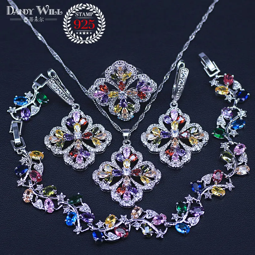 Дубай Стиль Muliticolor CZ 925 пробы Серебряные комплекты ювелирных изделий для Для женщин вечерние серьги/кулон/Цепочки и ожерелья/кольца/Браслет...