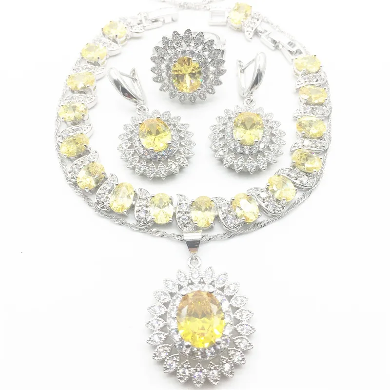 Цветок белый циркон желтый Ювелирные изделия из кристаллов Набор Серебристый цвет для Для женщин 925 логотип Браслеты/Цепочки и ожерелья/Сер...
