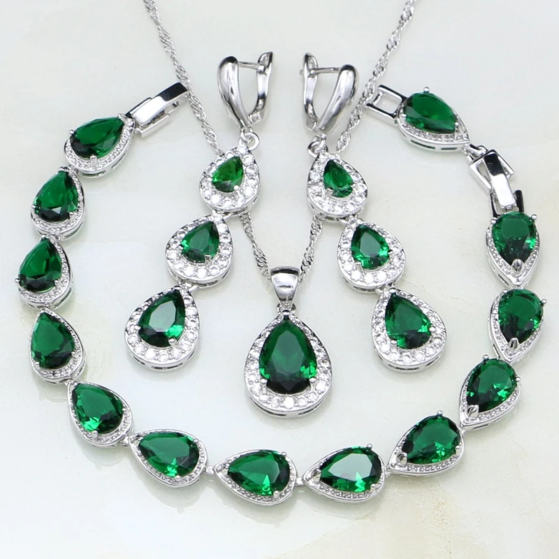 Капли воды зеленый цирконий Белый CZ 925 стерлингов Серебряные комплекты ювелирных изделий для Для женщин свадебные серьги/кулон/Цепочки и ож...