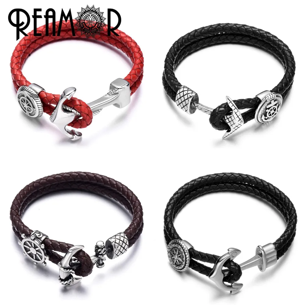 REAMOR 316l нержавеющей стальной компас щит бисера застежка в виде якоря подвески из натуральной кожи Для мужчин и Для женщин Браслеты браслеты ...