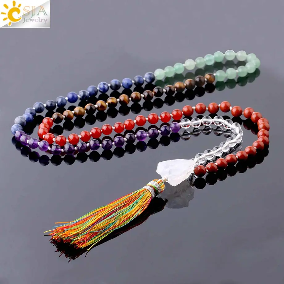CSJA Натуральный камень 7 Чакра длинные Цепочки и ожерелья белый подвеска с кисточкой и кристаллами узлом переплетения свитер цепи Для женщин...