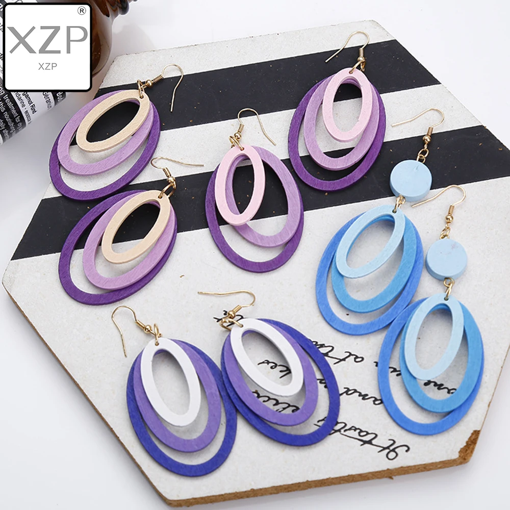 XZP корейские многослойные деревянные серьги-капли для женщин градиентные синие фиолетовые геометрические круглые овальные Висячие серьги для девочек ювелирные изделия подарок