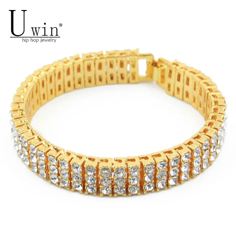 Uwin Iced хип-хоп браслет серебро/золото Цвет 3 ряд Bling Стразы Кристалл Для мужчин браслет панк ювелирные изделия 20 см
