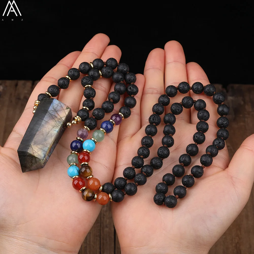 Подвеска из натурального Лабрадорита, 8 мм, черная лава, хрустальные бусины, ручная работа, ожерелье с узлом, длина 32 дюйма, N0521AMBG