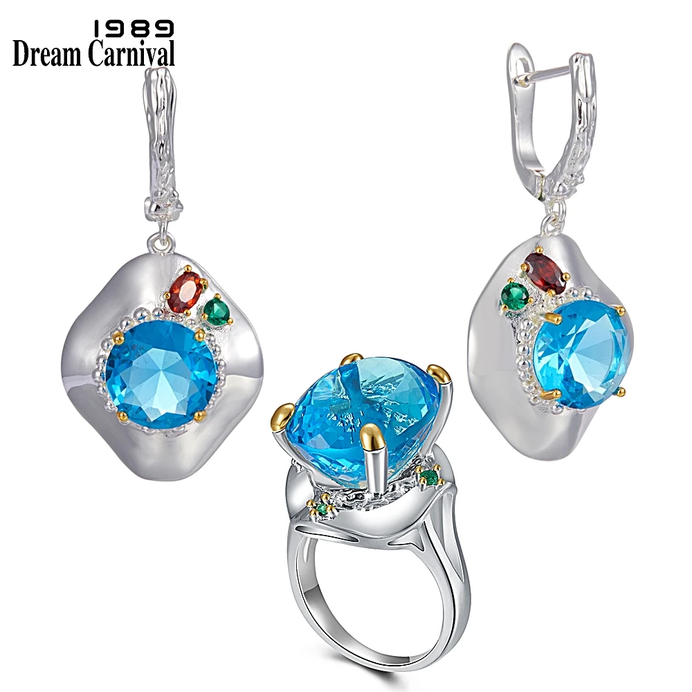 Набор украшений для женщин dreamcarnival, небесно-голубой циркониевый набор украшений для женщин, серьги с кольцом и шапочкой для свадьбы, драгоценности с сияющим цирконием ER4002S2