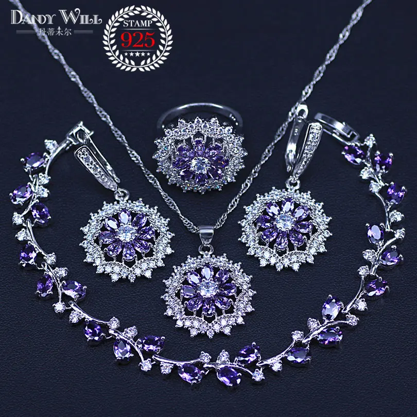 925 пробы серебро Для женщин свадебные красивое ожерелье с подвеской серьги кольца Браслеты комплект четко цветок Ювелирные комплекты с кри...