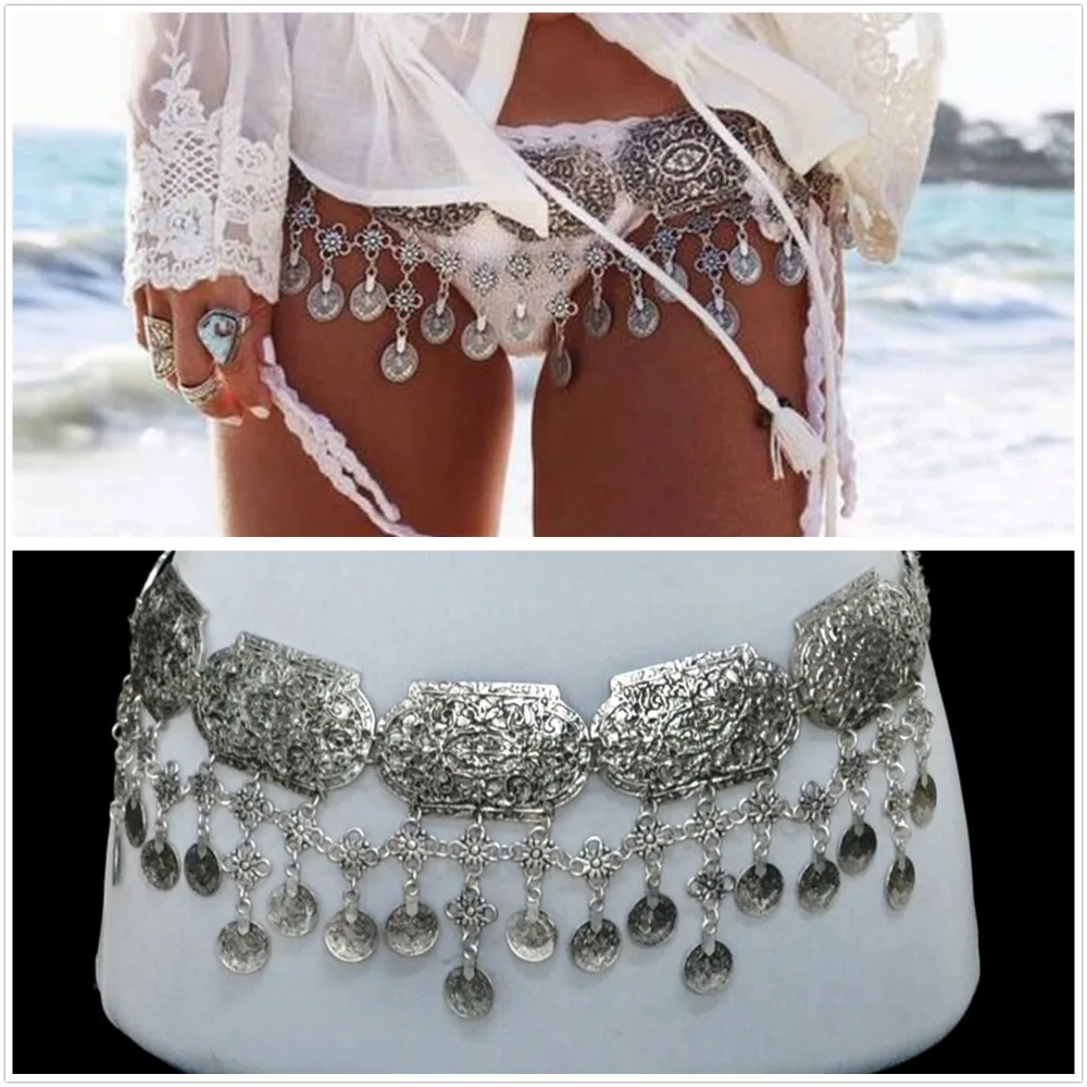 Богемные цыганские женские старинные серебряные цепи на талию Бохо Сексуальная Пляжная цепочка с монетами кисточкой турецкий Пояс живота ...
