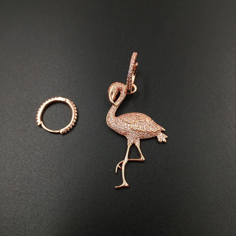 Серьги с кристаллами и розовым фламинго, ассиметричные серьги из циркония, микро-набор, розовое золото, серебряная птичка, украшения для музыкальной вечеринки