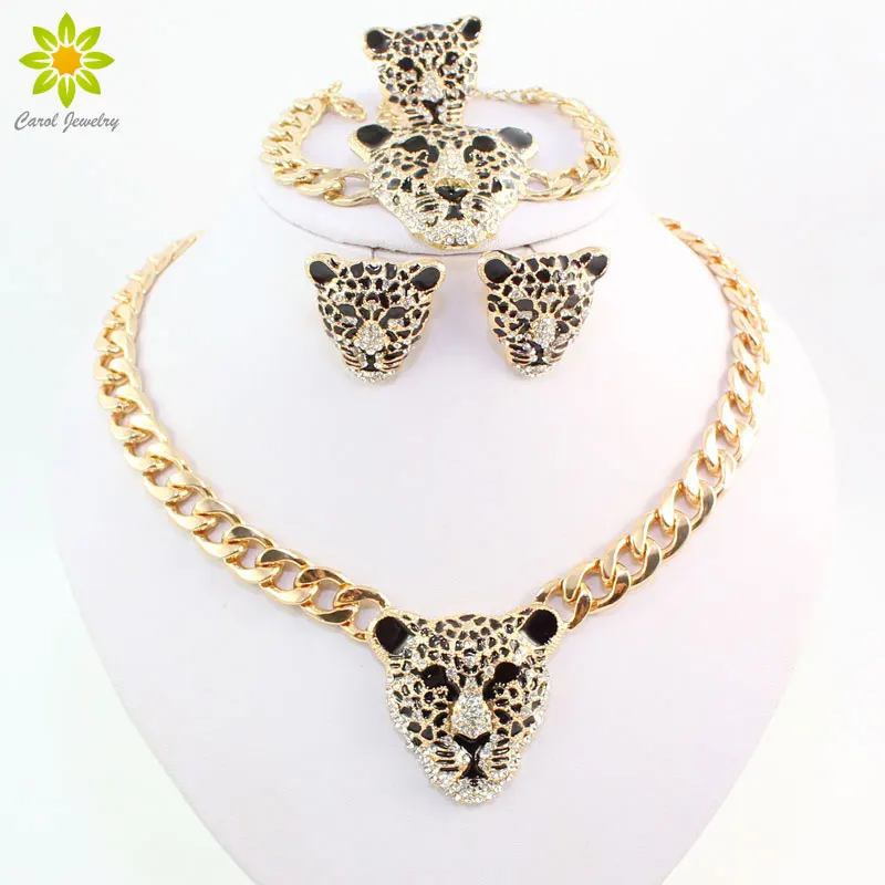 Прохладный головы леопарда браслет Серьги кольцо Цепочки и ожерелья Набор для Для женщин Мода золото Цвет костюм африканских Ювелирные наб...