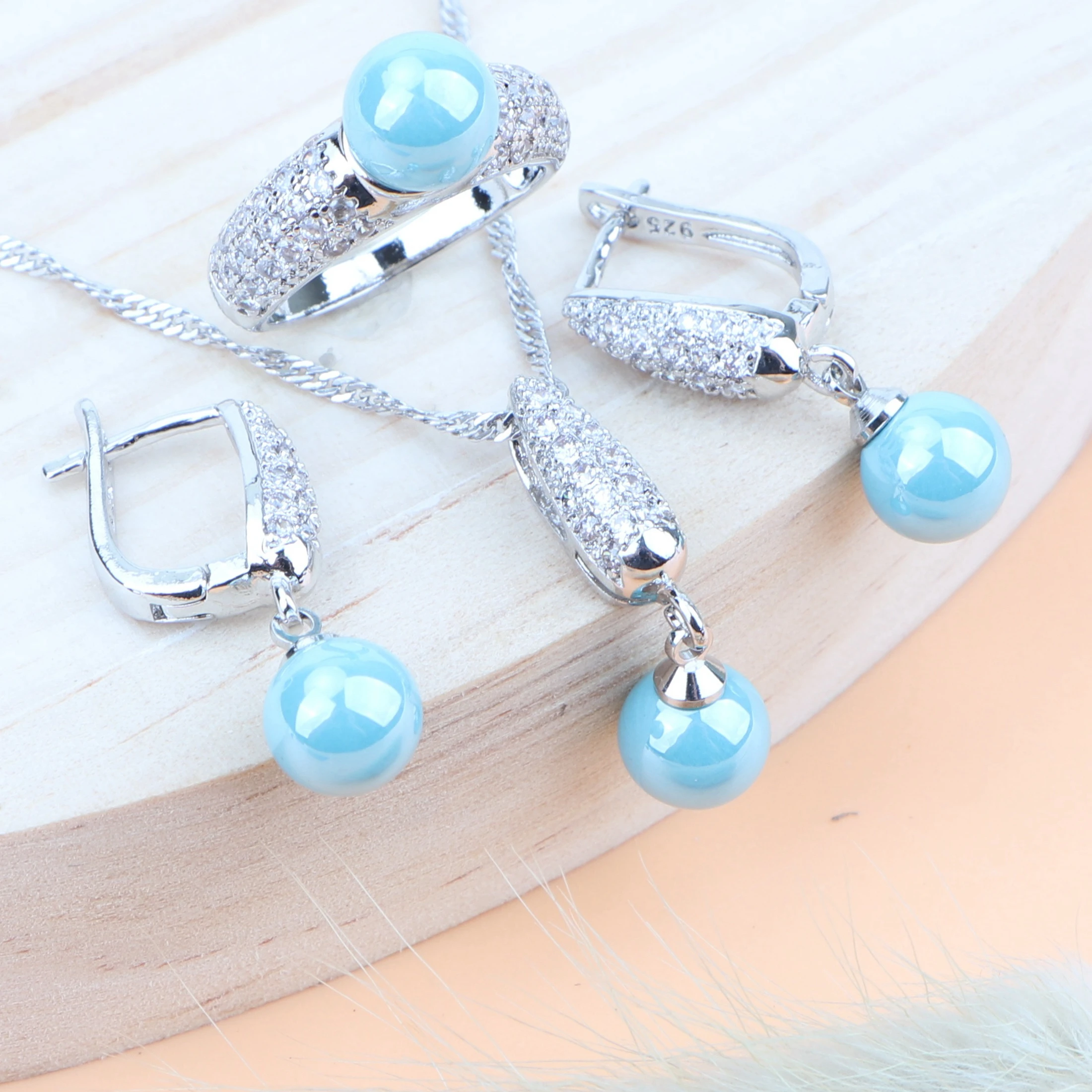 Жемчужное Серебро 925 свадебные комплекты ювелирных изделий костюм ювелирные изделия Женская циркониевая подвеска кольцо камень серьги Сва...