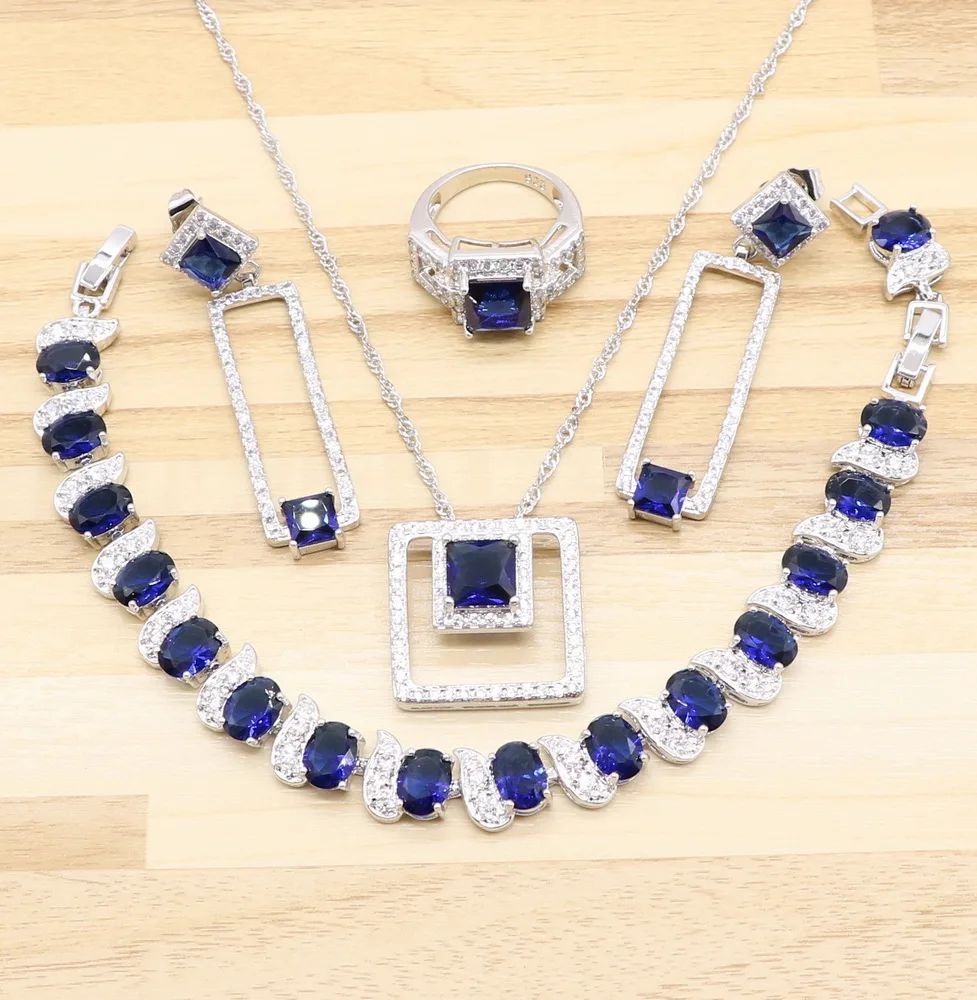2019 Женский комплект из четырех предметов, синий кубический цирконий, квадратный, Мода 925, серебряные ювелирные наборы, ангельское ожерелье д...