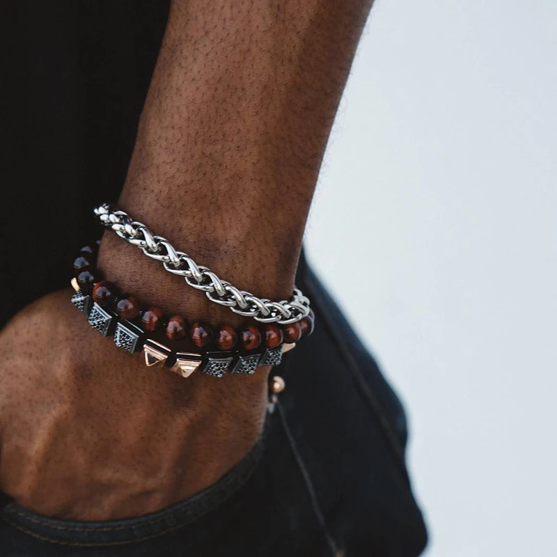 Мужской браслет из нержавеющей стали, многослойный браслет в стиле панк с бусинами из натурального камня, 2019