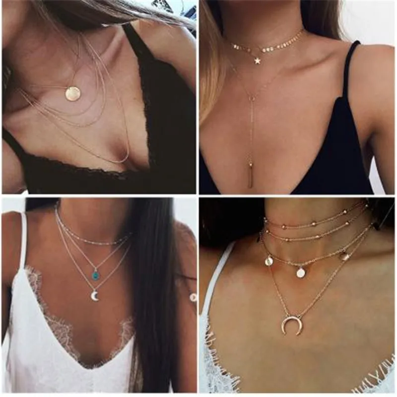 Винтажное многослойное ожерелье s для женщин, золотая металлическая длинная цепочка, монета, полумесяц, звезда, колье, подвеска, ожерелье, ювелирное изделие
