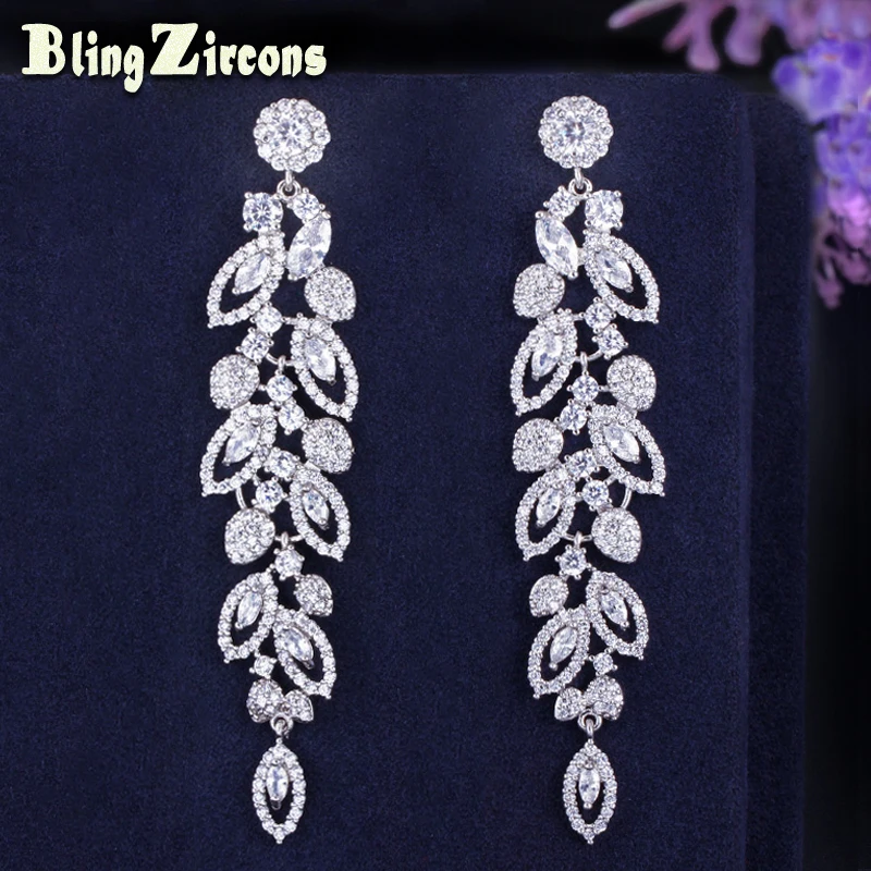BlingZircons 7,3 см Элегантные листьев кластера Marqusie камень Pave Цирконий Кристалл супер длинные свадебные серьги для невесты E151