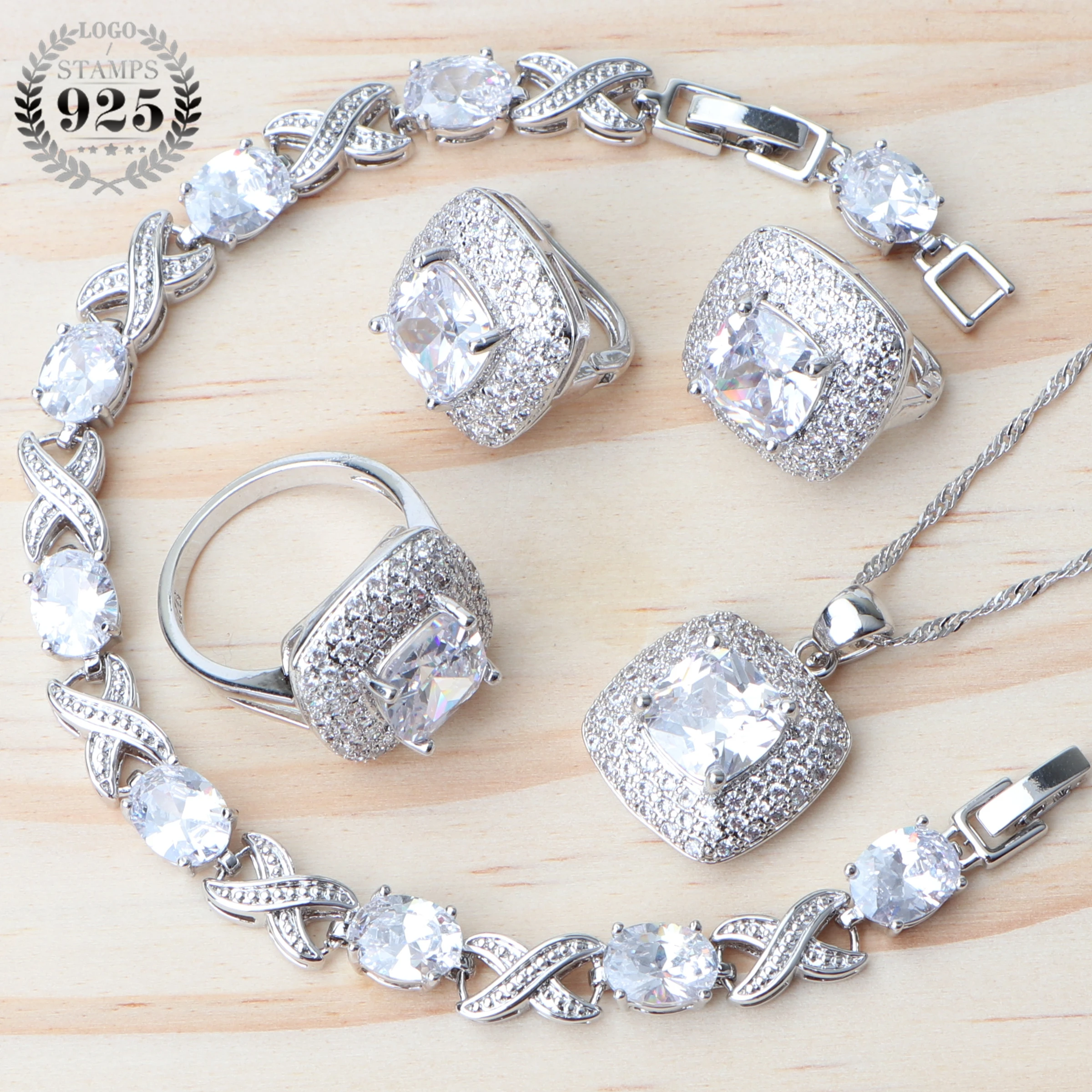 Белый циркониевый женский серебряный 925 Ювелирные наборы серьги с камнями Кулон ожерелье кольца браслет для свадебного набора подарочная к...