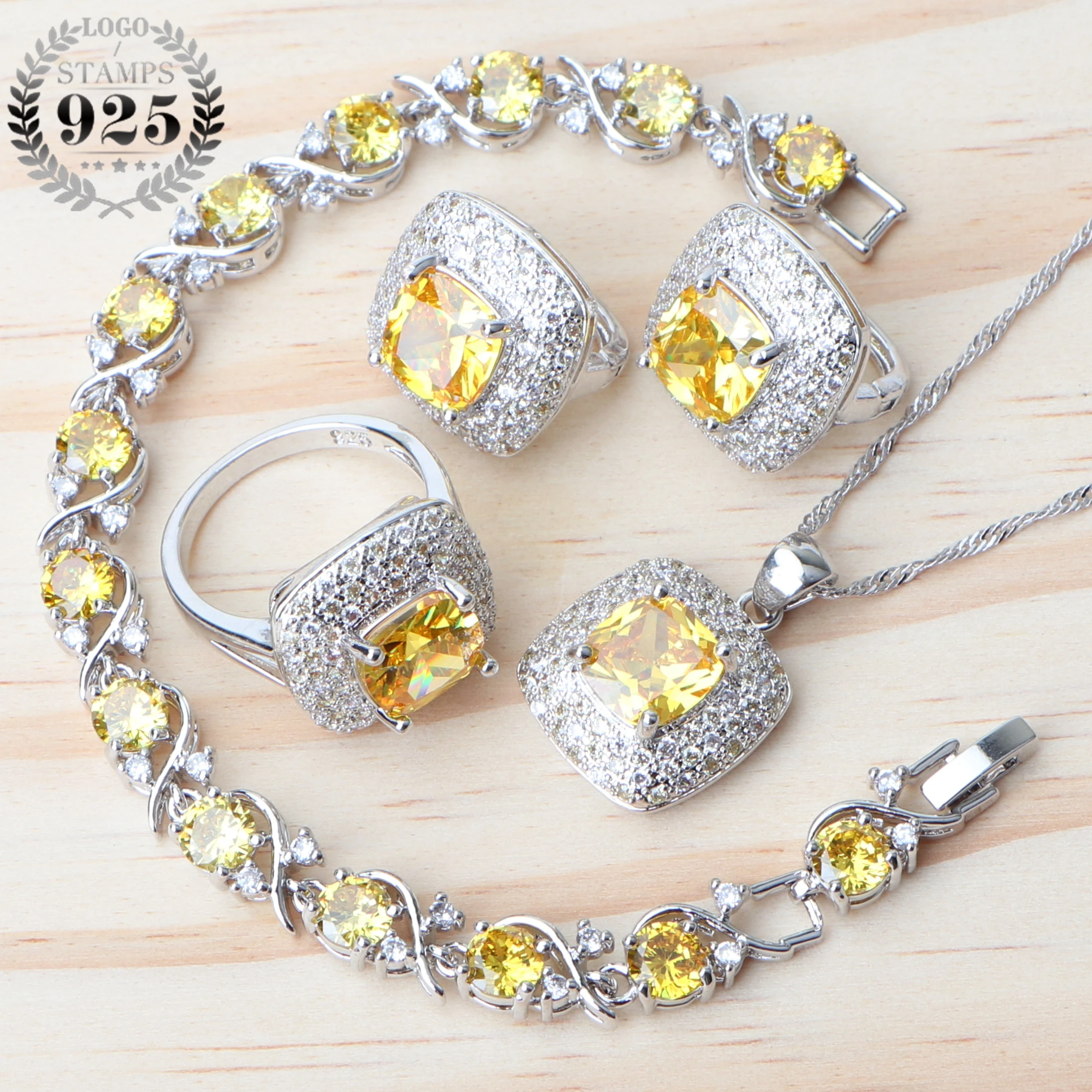 Свадебные комплекты ювелирных изделий из стерлингового серебра 925 пробы женские желтые серьги с цирконием камень кулон ожерелье кольца бра...