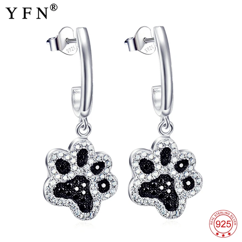 YFN, 925 пробы, серебряные серьги, черно-белые, CZ, кошка, собака, лапа, принт, висячие серьги для женщин, серьги в виде животных Ювелирные изделия, женские серьги