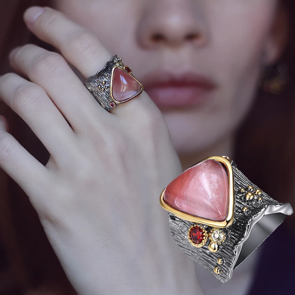 Женское кольцо, большие треугольные кольца из розового камня с черным покрытием
