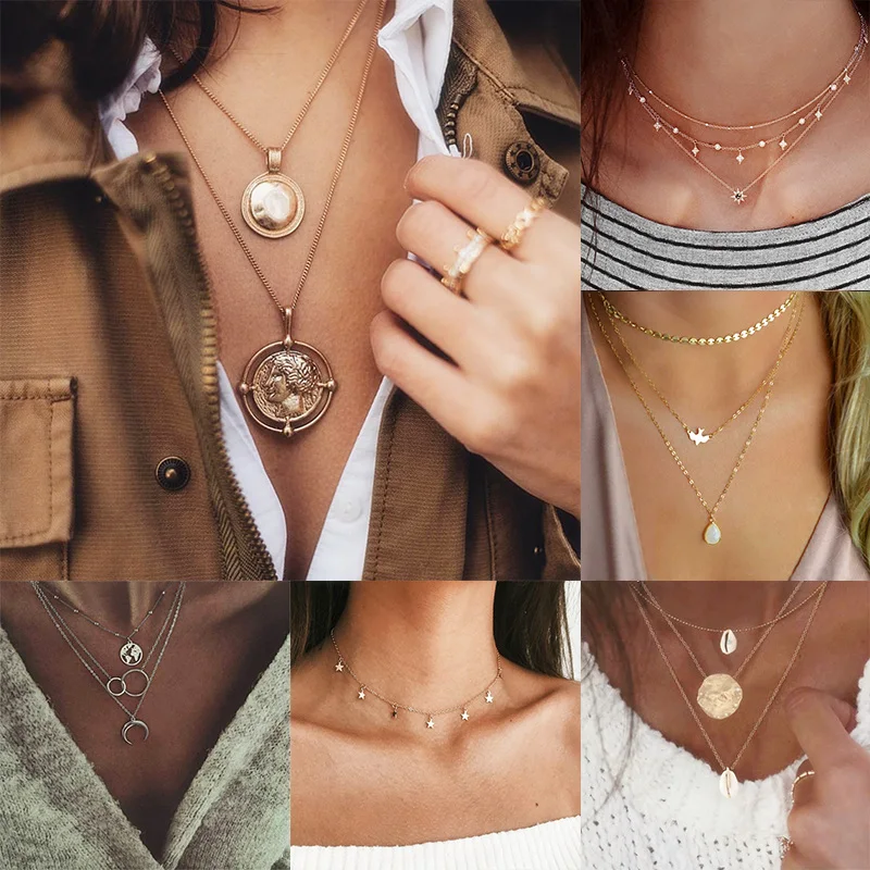 Новая мода золотой медальон в форме звезды ожерелье Модные женские простые Chorker ожерелье Многослойные бар колье с монетой цепочки на ключиц...