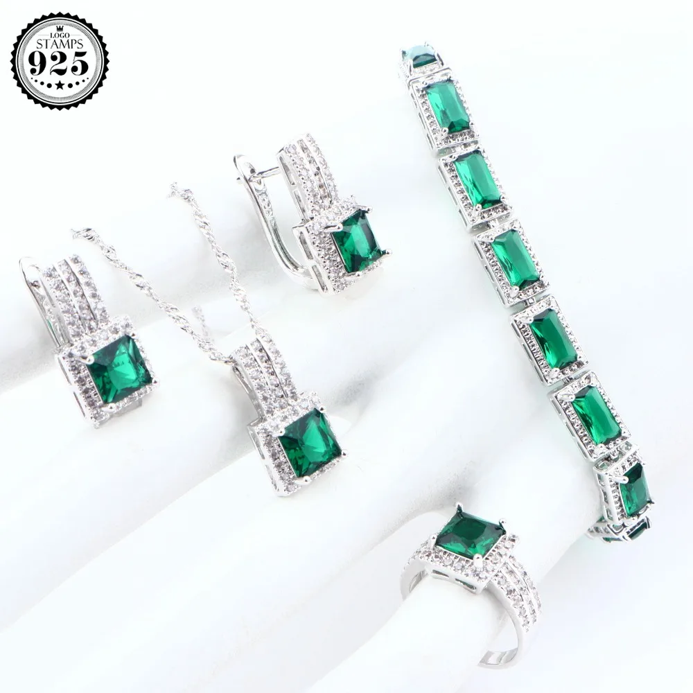 925 пробы серебряные свадебные женские украшения наборы, бижутерия зеленый фианит Браслеты Кулон Кольцо Цепочки и ожерелья Набор подарочных...