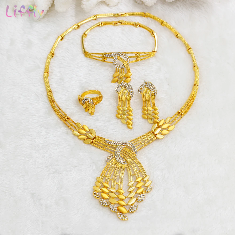 Liffly Свадебные украшения наборы Dubai Gold Цвет комплект ювелирных изделий Цепочки и ожерелья Серьги Браслет для Для женщин Свадебные украшения