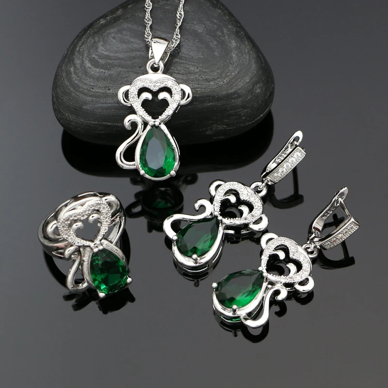 925 серебро в форме обезьяны ювелирные изделия зеленый фианит комплекты украшений для женщин серьги кулон кольца ожерелье набор