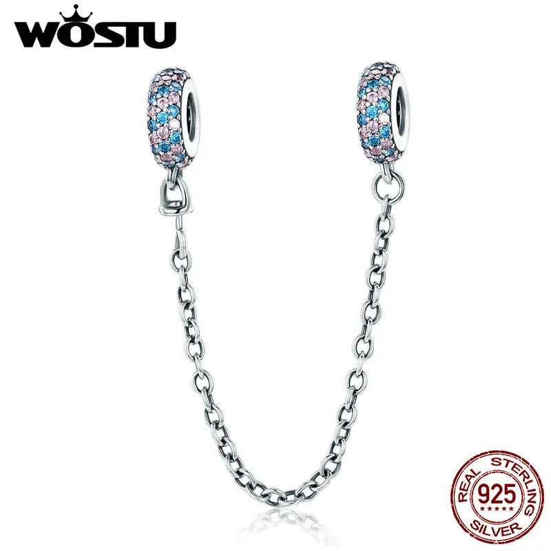 WOSTU Горячая 925 пробы серебро Проложить вдохновение безопасности цепи Шарм розовый и синий CZ подходят оригинальные бусины браслет ювелирные изделия подарок CQC379