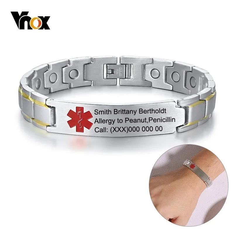Vnox Бесплатная Персонализированная гравировка медицинский оповещение ID браслеты для мужчин 12 мм нержавеющая сталь магнитные браслеты терапия ювелирные изделия