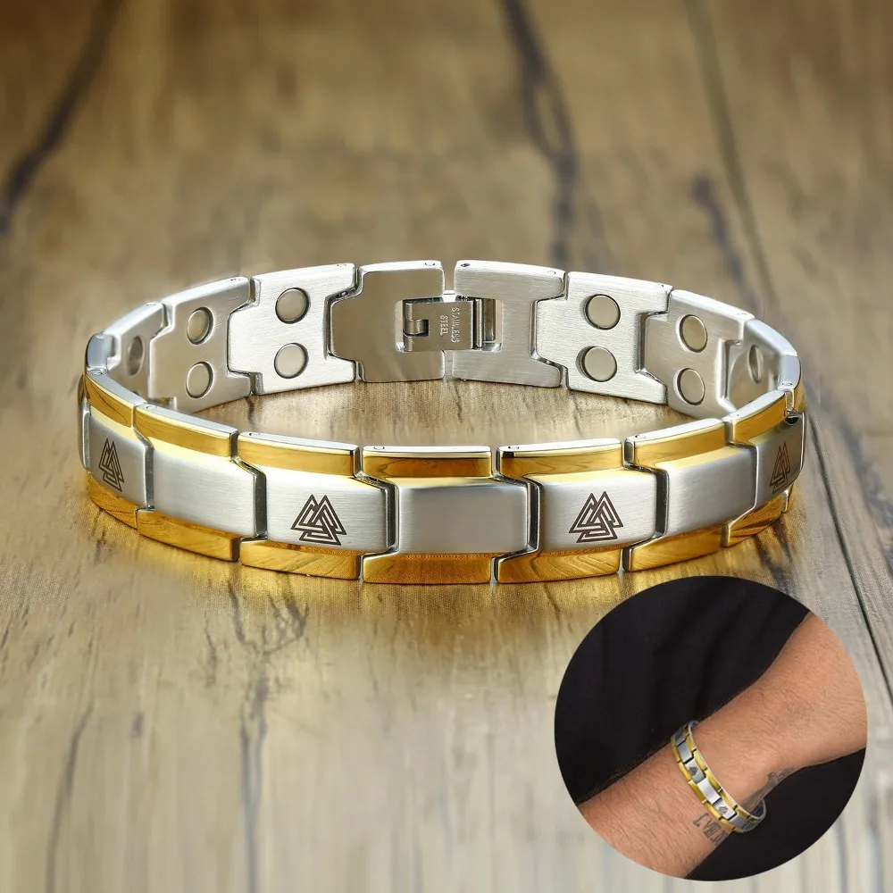 Двухтональный мужской магнитный браслет из нержавеющей стали с двухрядными магнитами Brazalet с лазерной гравировкой Viking Symbol Jewelry