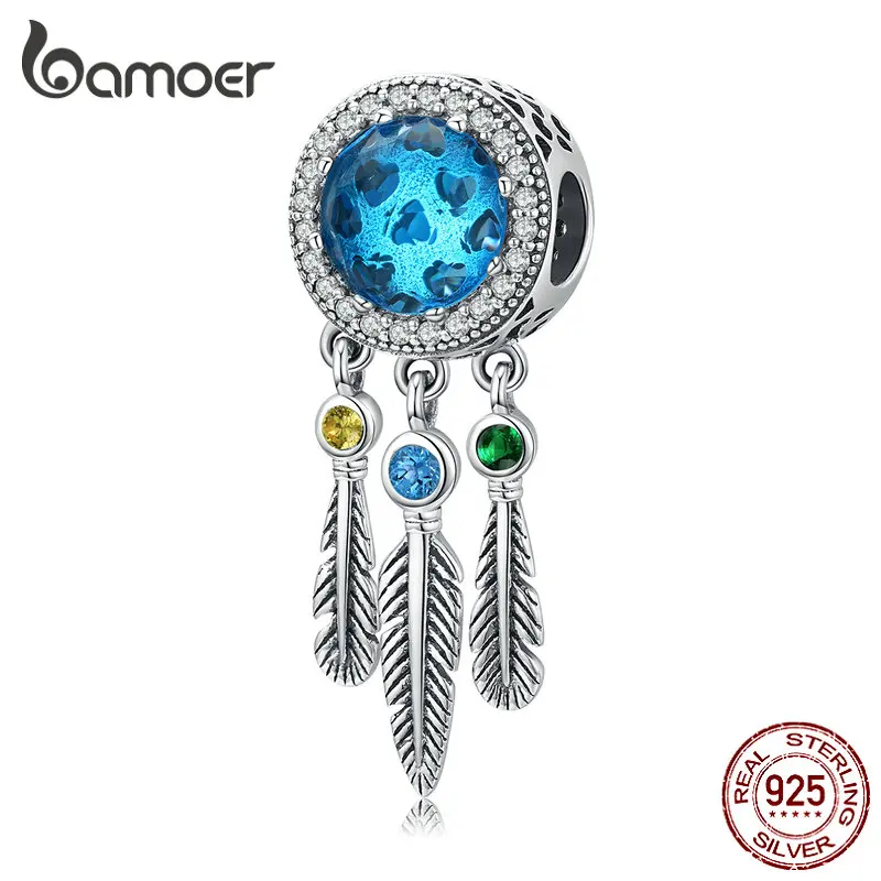 Bamoer Ловец снов перо Длинные стеклянные бусины Шарм Подходит оригинальный 925 для женщин браслет стерлингового серебра 925 ювелирных изделий SCC1384
