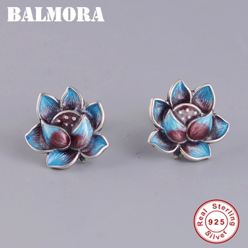 BALMORA Настоящее серебро 925 проба ретро серьги-гвоздики в форме лотоса для женщин леди подарок Романтические элегантные эмалированные ювелир...