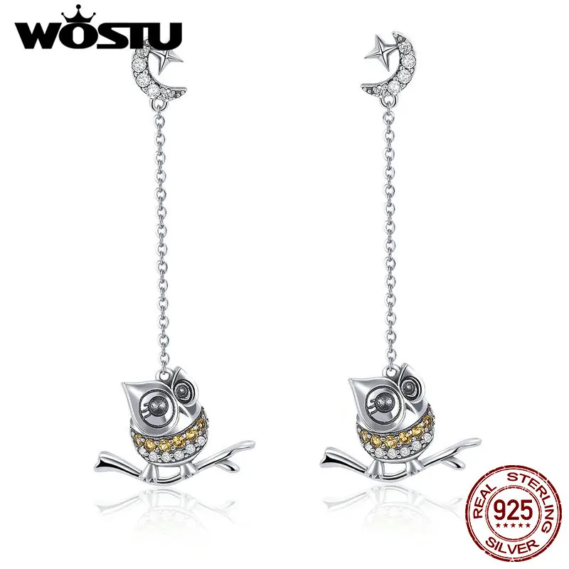 WOSTU, высокое качество, 925 пробы, серебро, сова, животные, висячие серьги для женщин, женские длинные серьги, ювелирное изделие, подарок на день ...