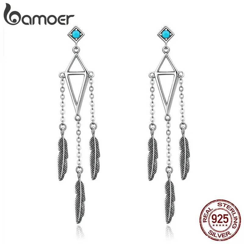 BAMOER, высокое качество, 925 пробы, серебро, перо, колокольчики, висячие серьги для женщин, винтажные серебряные ювелирные изделия, подарок SCE529