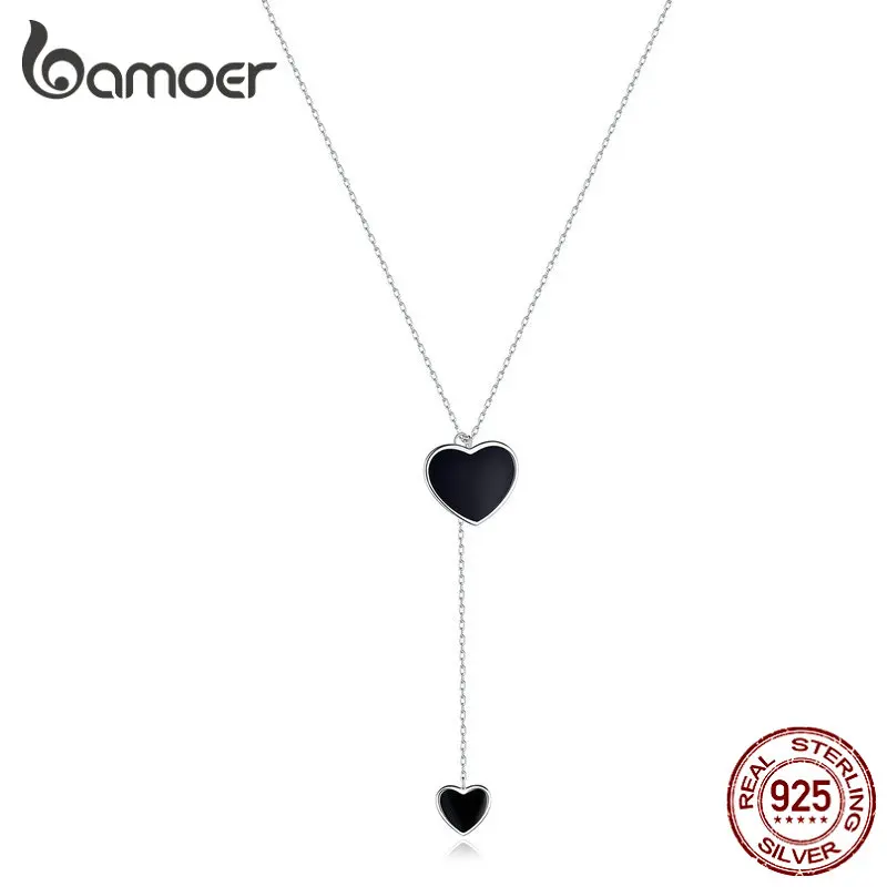 Bamoer, ожерелье с двойным сердцем для женщин, простая черная эмаль, y-образная цепочка, ожерелье s 925 Femme, Стерлинговое серебро, ювелирные издели...