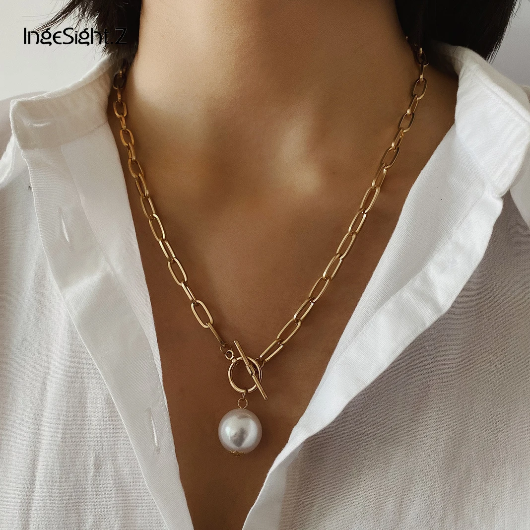 IngeSight.Z панк имитация жемчужная подвеска в стиле барокко ожерелье Снаряженная кубинская толстая цепочка застежка Длинные ожерелья для женщин ювелирные изделия