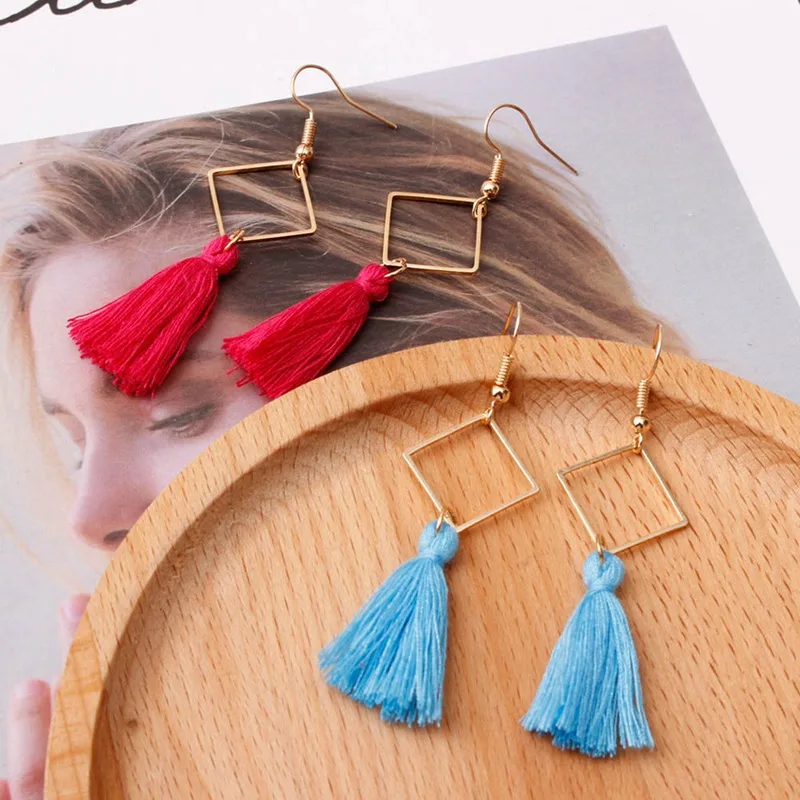 Женские квадратные простые серьги с кисточками в стиле бохо, из хлопчатобумажной шелковой ткани, с бахромой, длинные серьги для невесты, Женские Ювелирные украшения