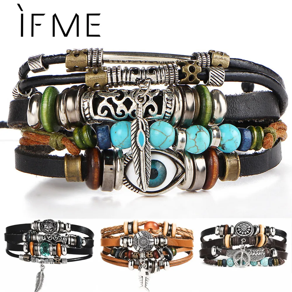 IF ME BOHO Тибетский камень перо Многослойный кожаный браслет глаз рыба талисманы бусины браслеты для мужчин Винтаж Панк обёрточная бумага