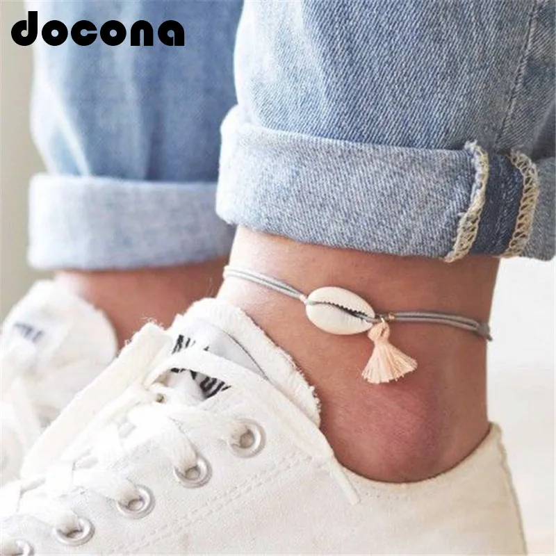 Docona Boho кисточкой Shell ножной браслет с подвеской для Для женщин девочек серый веревка регулируемые ножные браслеты Браслеты пляжные бижутер...