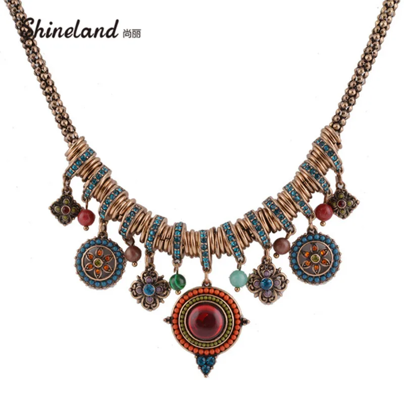 Винтаж Богемия Стиль Модные украшения золотой цвет круглый Форма Цвет Фул смолы камень и Бусины Подвески заявление Цепочки и ожерелья для Д...