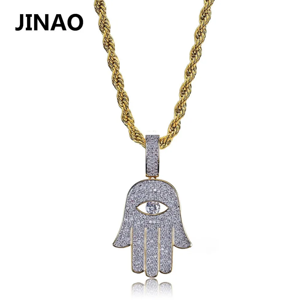Jinao для хип-хопа Позолоченные Льдом Из Злой Глаз Хамса ручной микро проложить циркон кулон ожерелье для мужчин и женщин блестящие украшения