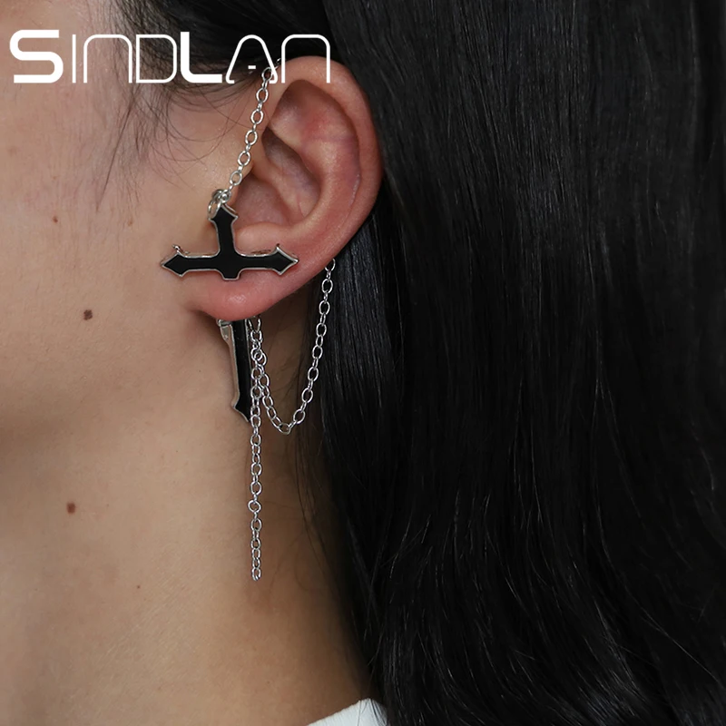 Sindlan барочные серьги с черным крестом для женщин темно-готический стиль ухо манжеты с серебряной цепочкой модные Крутые Девушки Ювелирные изделия для ушей