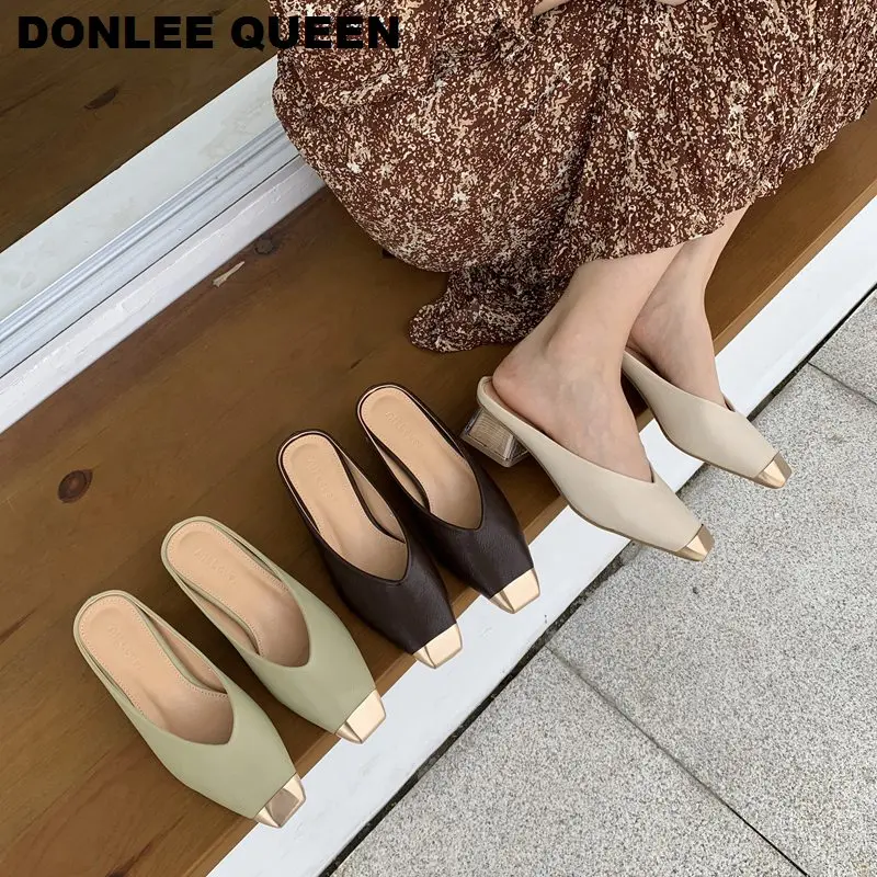 Модные женские тапочки с квадратным носком; Квадратный низкий каблук; Открытые шлепанцы; Роскошная брендовая элегантная женская обувь с металлическим носком; Повседневные тапочки