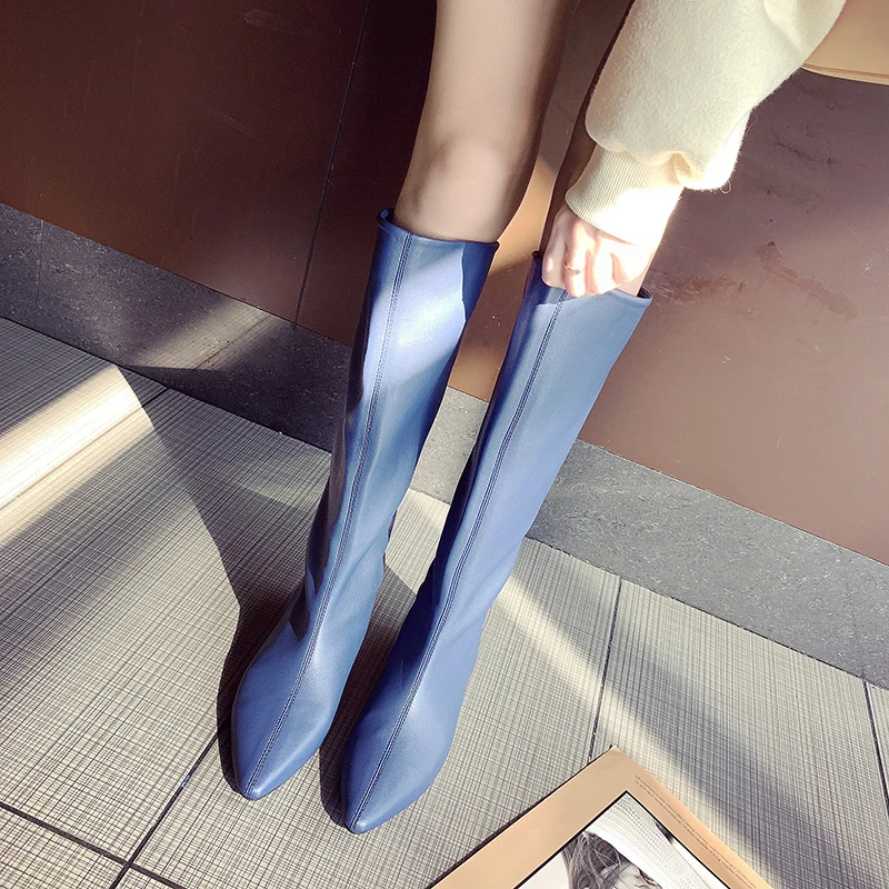 Популярные женские ботинки на высоком каблуке; сезон весна-осень; женские ботинки; ботинки до середины икры; обувь на высоком каблуке; джинсовые ботинки; ковбойские ботинки