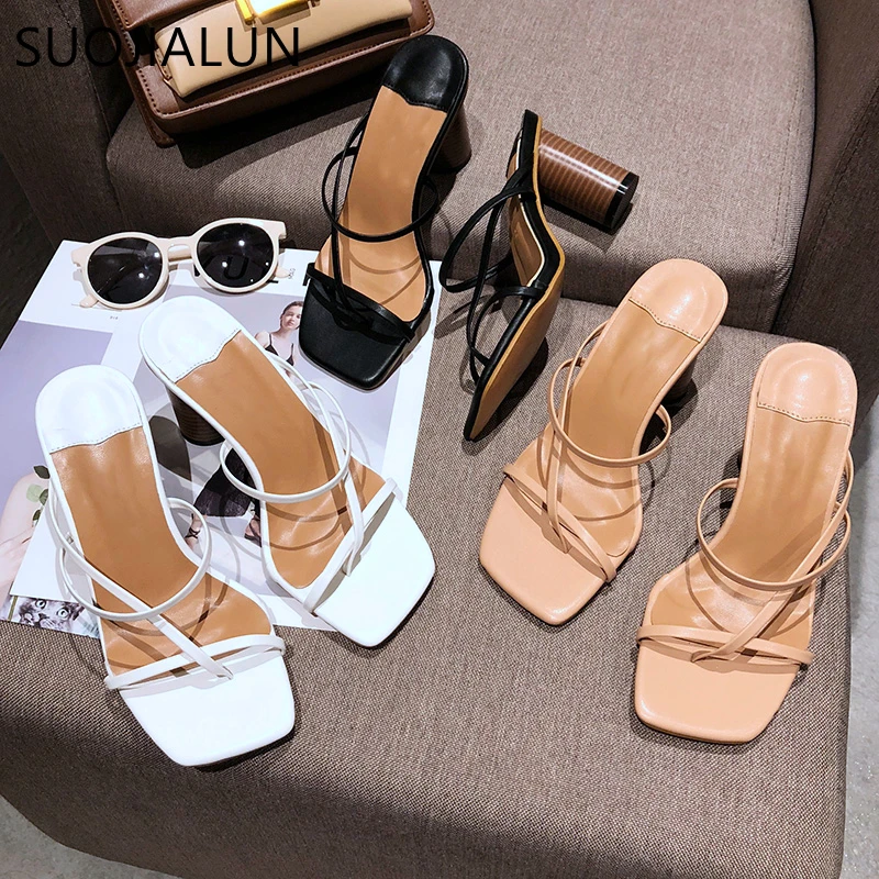 SUOJIALUN/Новинка 2020 года; летние женские сандалии; шлепанцы на высоком цилиндрическом каблуке; уличные Вьетнамки с узкими ремешками; женские шлепанцы без задника