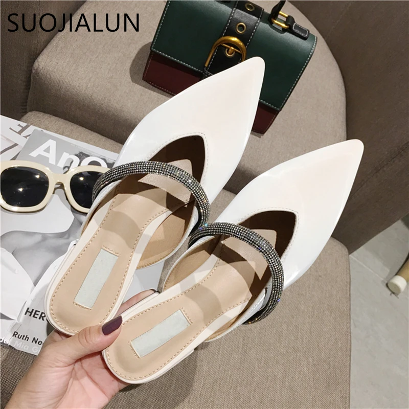 SUOJIALUN/2020; роскошные женские шлепанцы с кристаллами и цепочкой; женские шлепанцы с острым носком без застежки; женские босоножки без задника; сезон весна