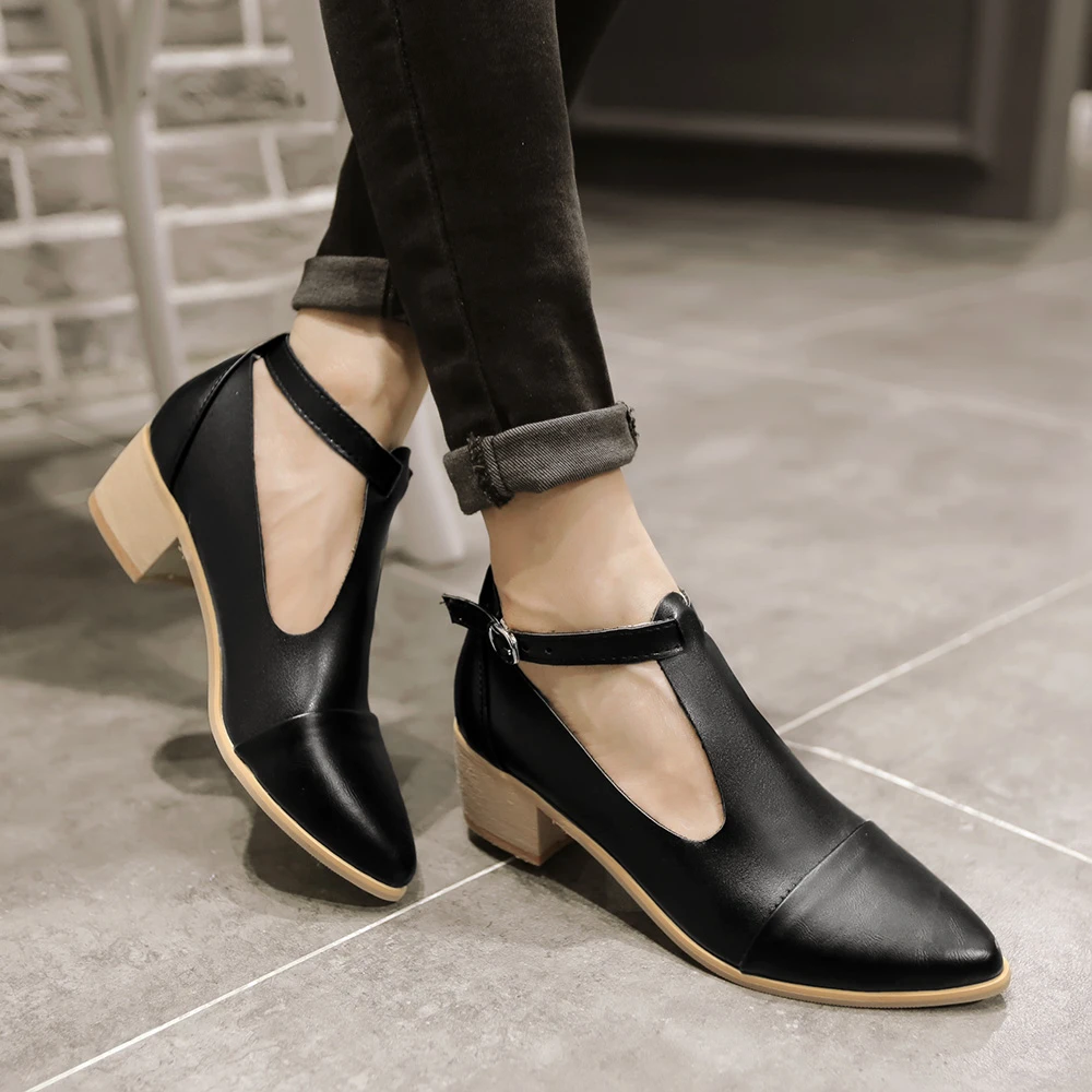 2018 винтажная женская обувь из искусственной кожи женские высокие туфли-лодочки в римском стиле с острым носком, пряжкой и Т-образным ремешком, большие размеры 32-43