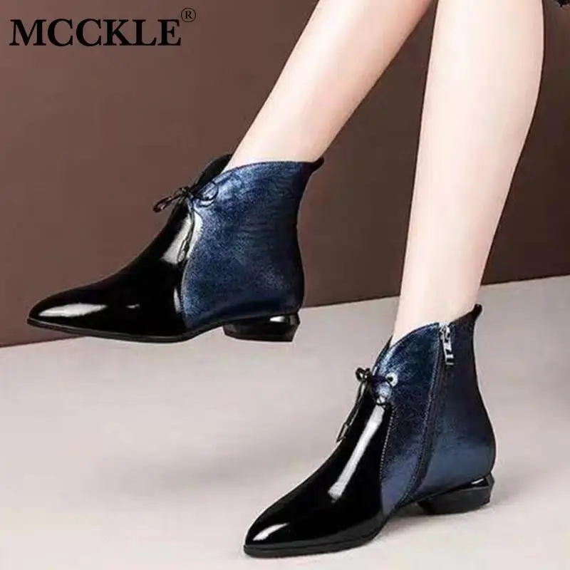 Mcckle женщины острый носок, на шнуровке, Ботильоны на каблуке Для женщин Лакированная кожа полусапожки смешанных Цвет женская обувь на молнии